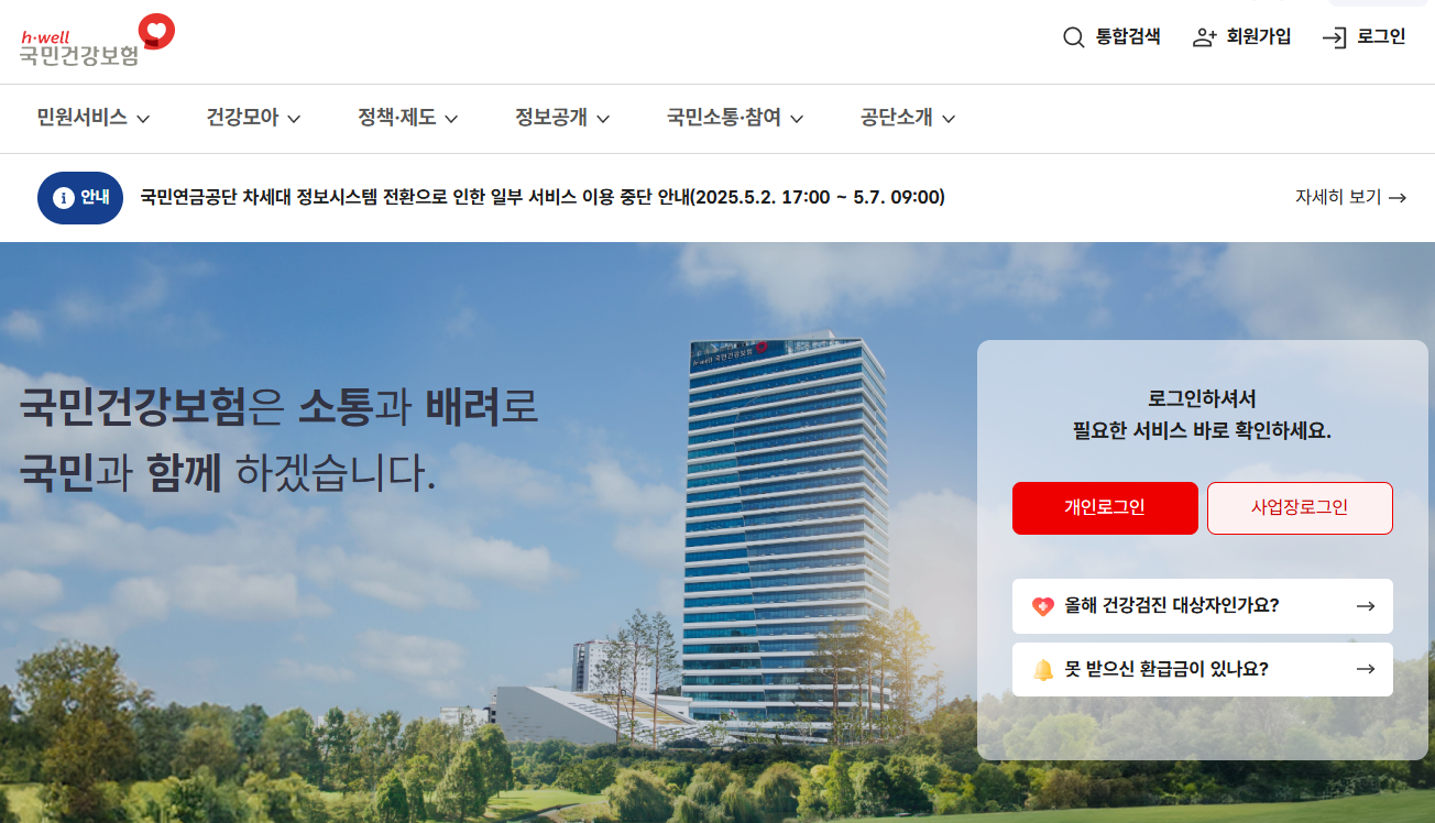 - 국민건강보험공단 공식 홈페이지 접속
